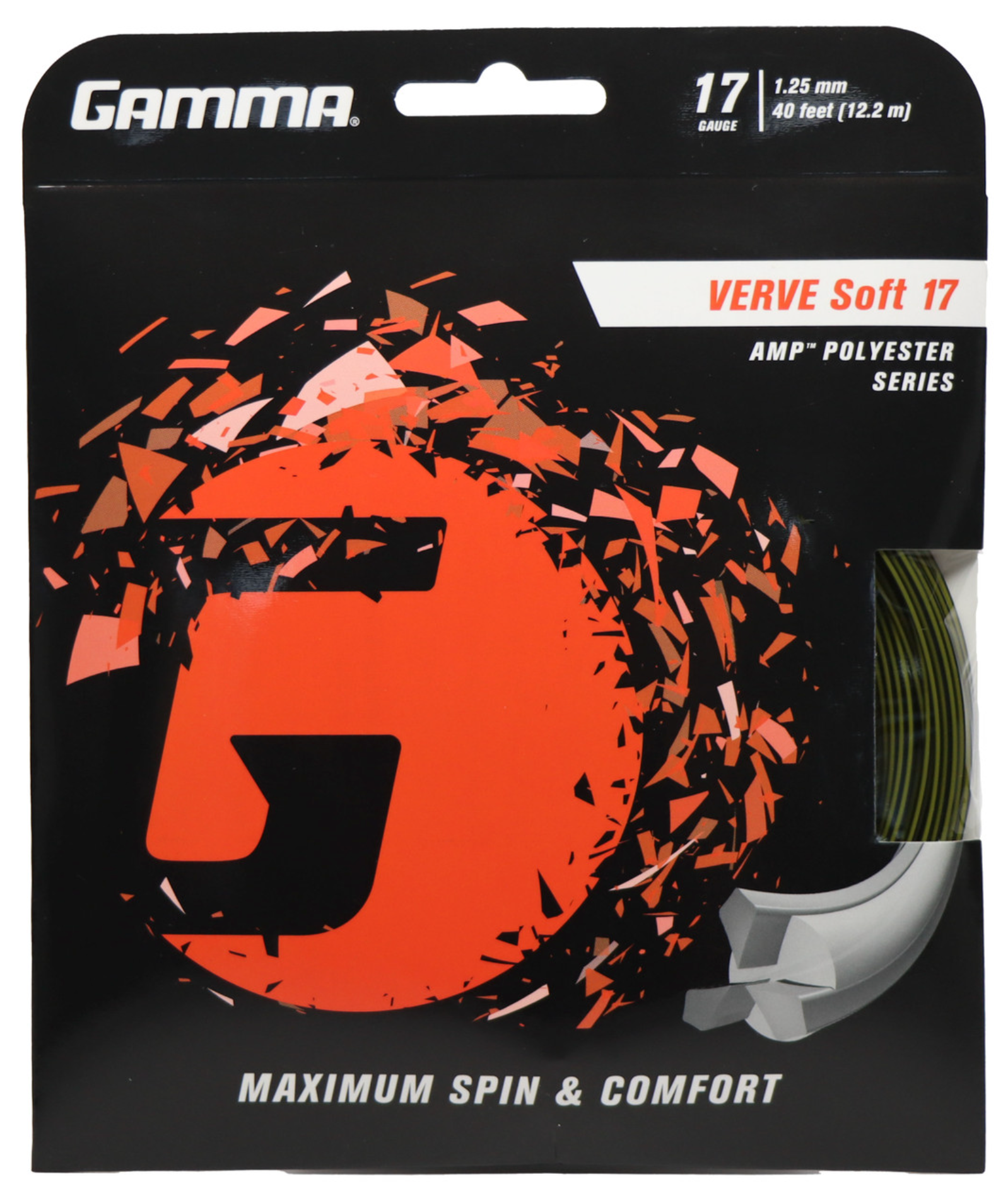 GAMMA Verve Soft is a soft co-polyester string which offers maximum spin potential whilst maintaining comfort levels. A combination of stiff and soft materials aim to please harder hitters who require power, control and forgiveness. There are three protruding, stiffer, filaments which maximise ball bite for higher levels of spin potential and to help penetrate shots from all areas of the court.