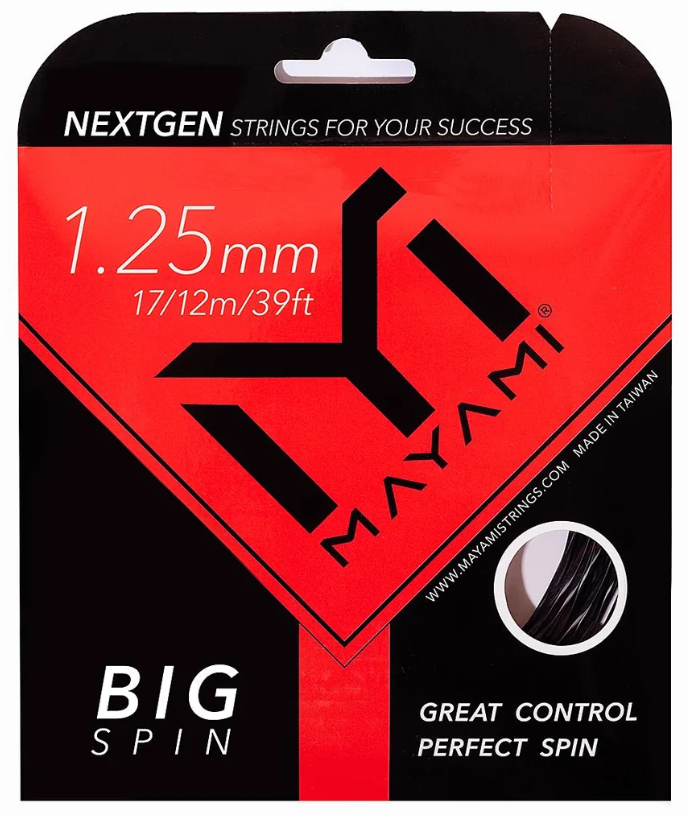 MAYAMI BIG SPIN is a triangular contorted polyester string with astonishing qualities that produces a huge amount of spin, comfort and control. An unordinary oddity on the tennis string market!